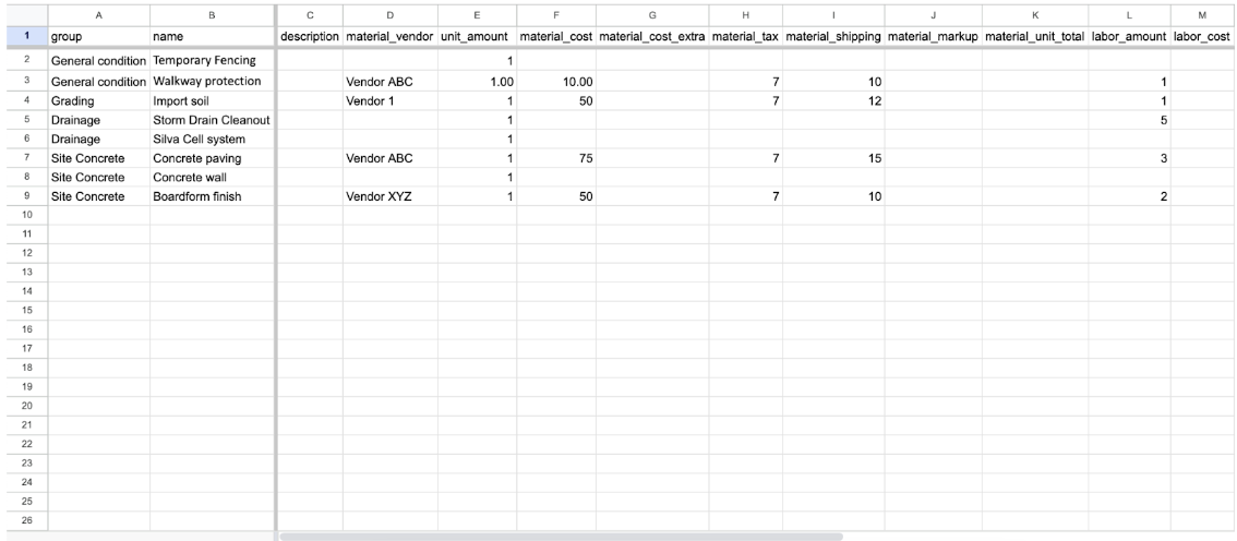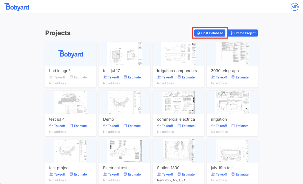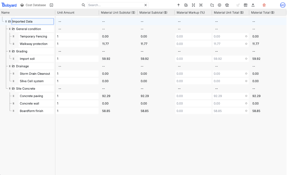 The database is structured just like the estimate table. It has the same columns and maintains the groups and items structure. This is where you can create new rows and manage existing ones in the database for use in projects. It’s accessible from the dashboard: